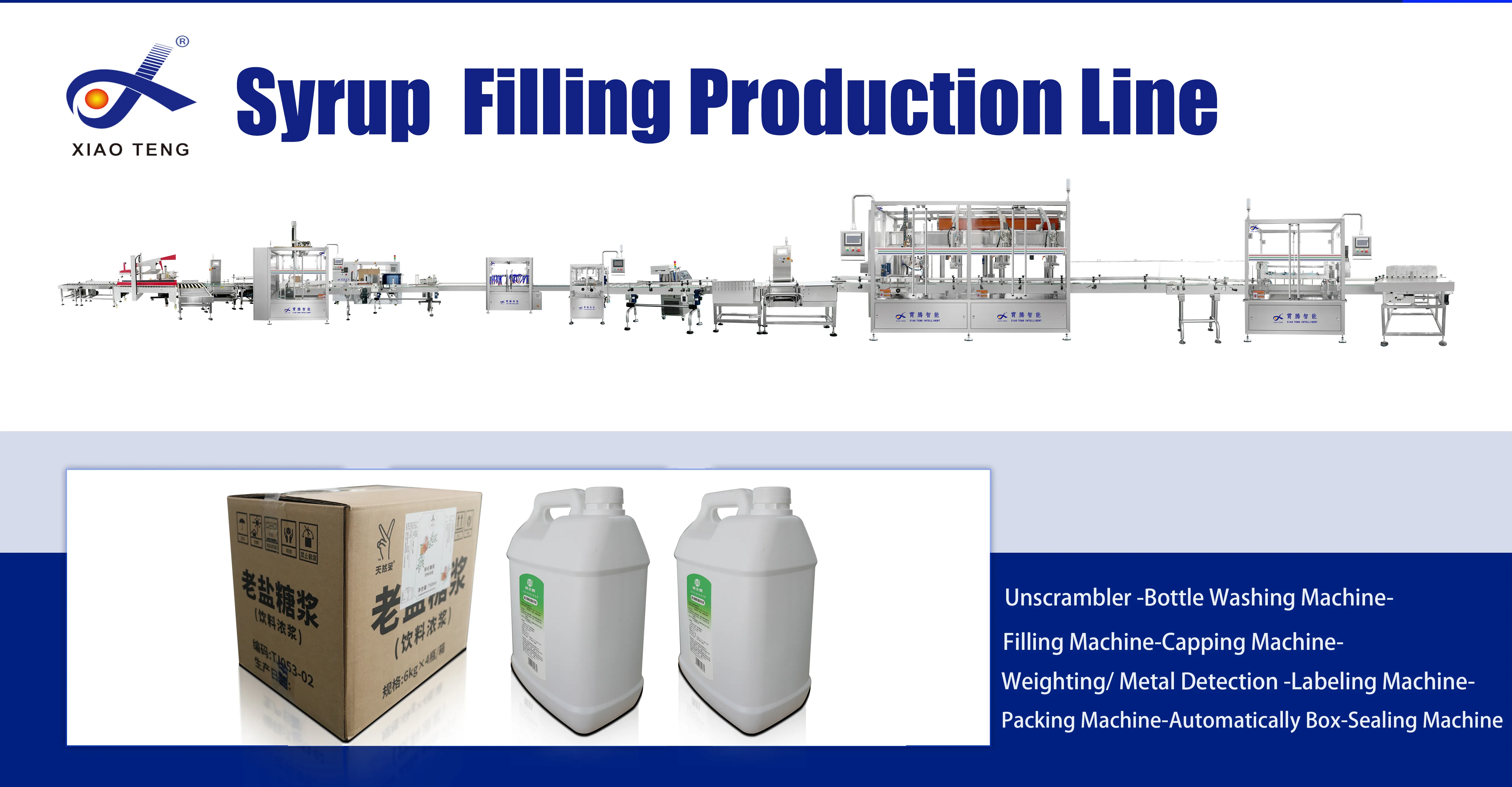 This 5L large-capacity syrup filling line for multi-bottle syrup. From bottle unscrambling and washing to filling, capping, labeling, case packing, and palletizing, the entire line can be customized to meet your needs. It's an ideal choice for the pharmaceutical, daily chemical, and food industries. For more details, please contact us.