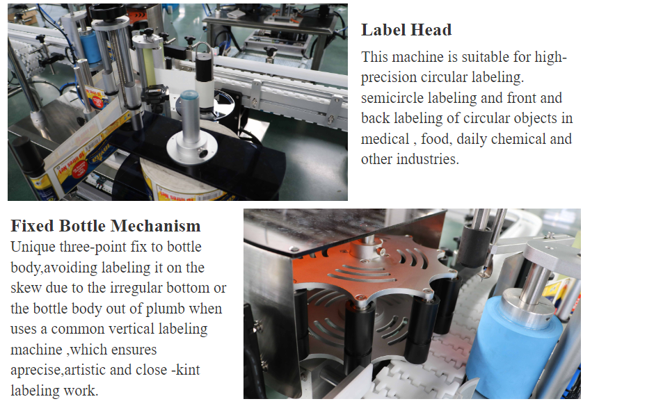 Unique three-point fix to bottle body,avoiding labeling it on the skew due to the irregular bottom or the bottle body out of plumb when uses a common vertical labeling machine ,which ensures aprecise.
