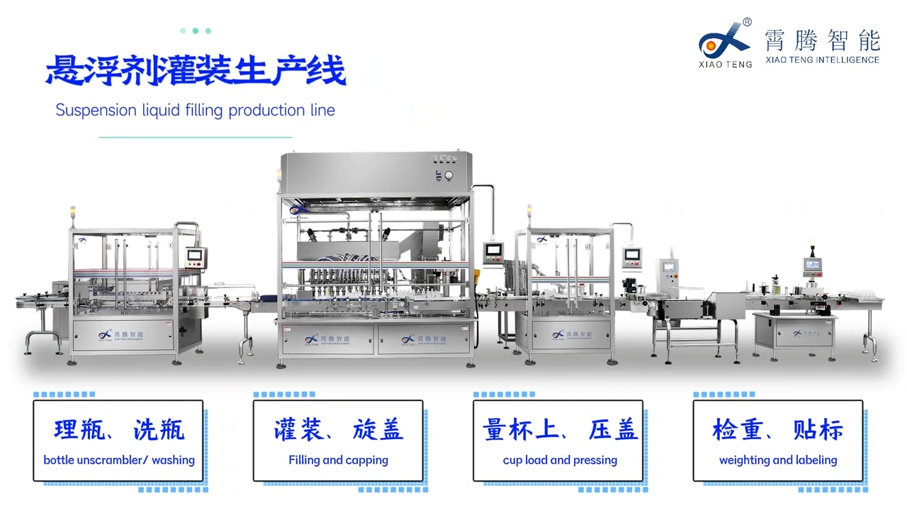 The suspension liquid filling production line is composed of six types of equipment: bottle unscrambler, bottle washing machine, Filling and Capping machine,Cup Load And Pressing,Weight Checking and Labeling. Each equipment can also be working independently; It can automatically complete bottle unscrambling, cleaning,filling, screw (rolling) capping, and other processes and is suitable for syrups, tinctures, health products, cosmetics,sauces and other liquids with different viscosity in the factory and food industries packaging line production.